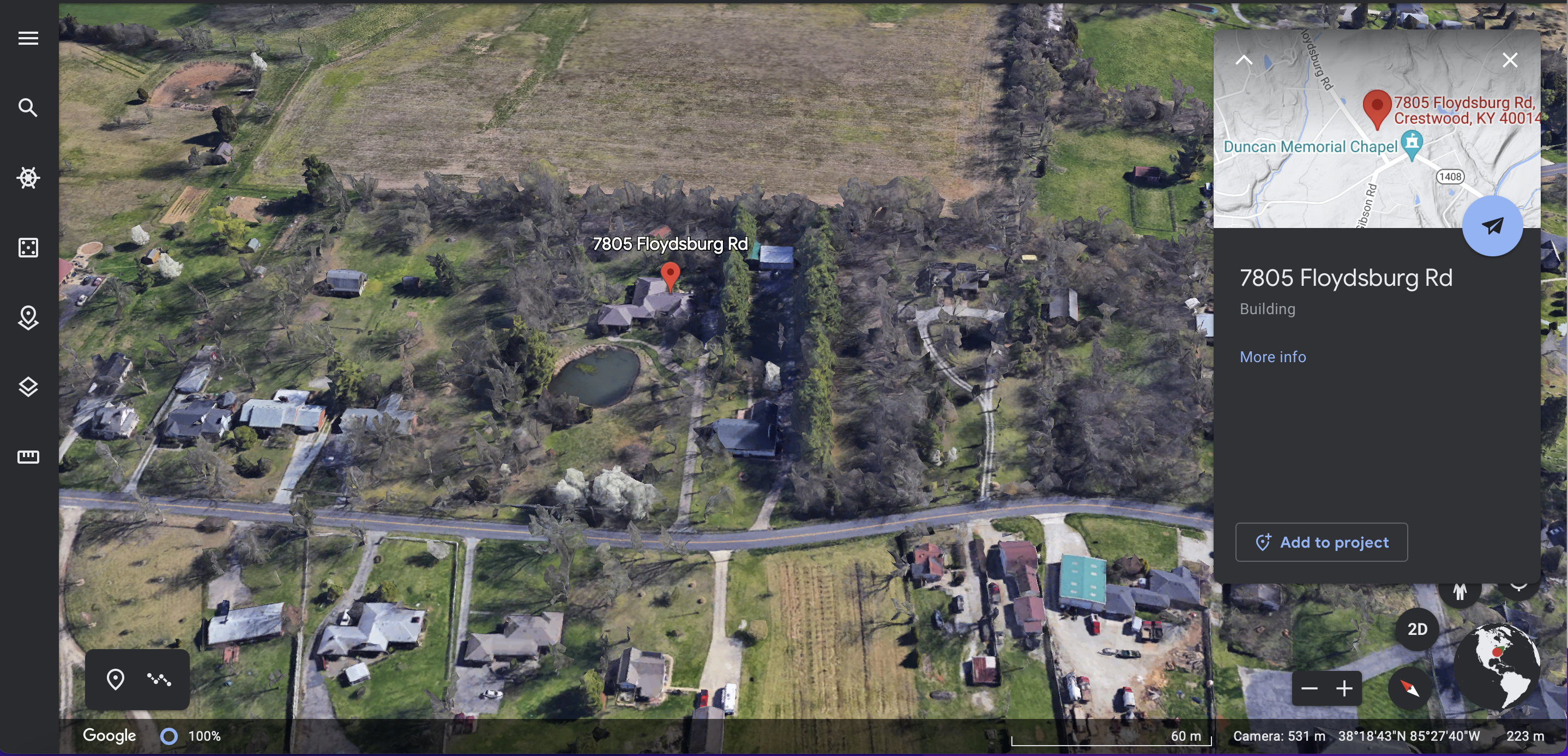 Location: In Oldham County, from KY 146, turn onto Floydsburg Road and continue south for about 1 mile. The property is on the left just before the bend in the road connecting it to Old Floydsburg Rd. It is about ¼ mile from Duncan Memorial Chapel.
