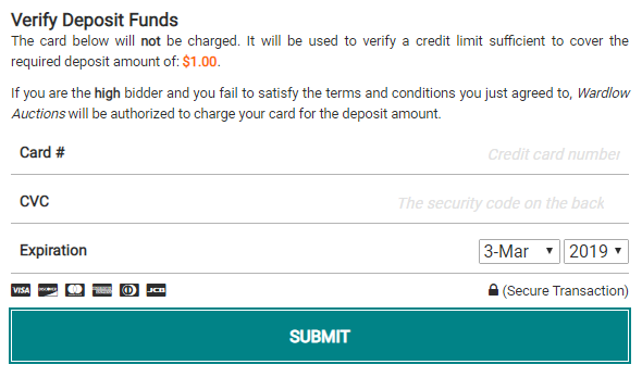 You will be prompted to enter your credit card information before you bid on a specific auction. This is only to verify available funds, and will not charge your credit card.